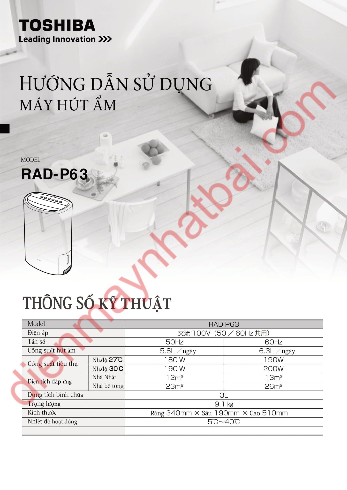 dienmaynhatbai.com chia sẻ hướng dẫn sử dụng máy hút ẩm Toshiba RAD-P63 được dịch nguyên văn từ catalogue của nhà sản xuất.