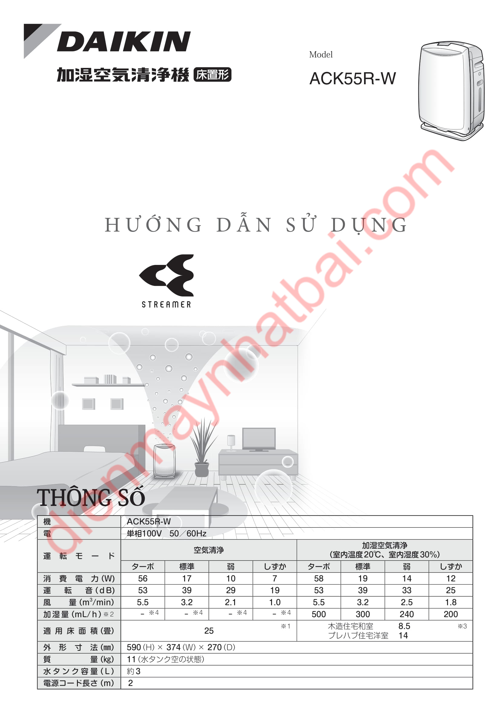 dienmaynhatbai.com chia sẻ hướng dẫn sử dụng máy lọc không khí kiêm tạo ẩm Daikin ACK55R, MCK55R được dịch nguyên văn từ catalogue của nhà sản xuất.